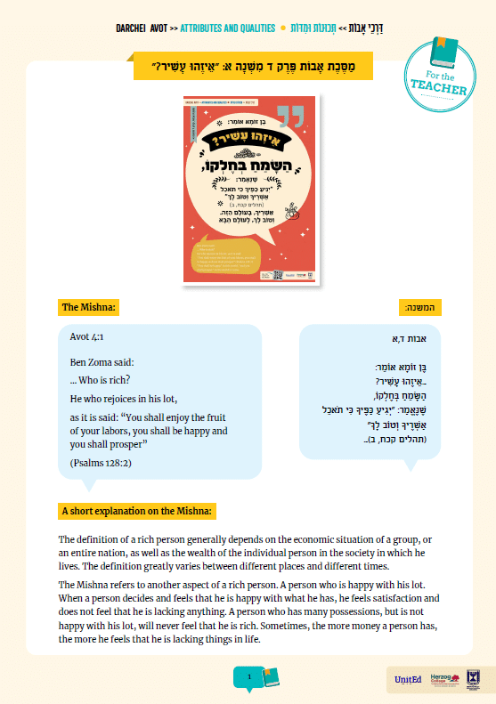 The pilot includes 15 moral and value sayings from the chapters of Pirkei Avot, according to the following topics: